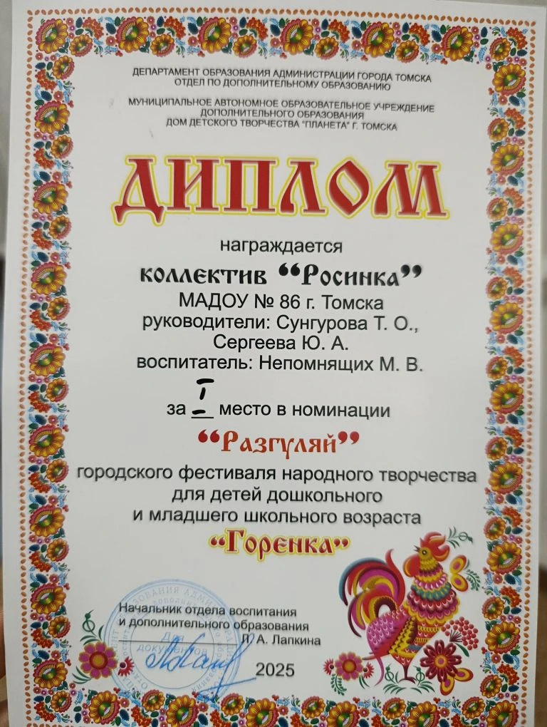 Поздравляем коллектив детского сада «Росинка» с заслуженной победой в номинации «Разгуляй» городского фестиваля народного творчества «Горенка»! Организаторы фестиваля — Департамент образования администрации города Томска и МБОУ ДО ДДТ «Планета».